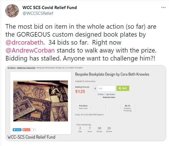 WCC SCS Covid Relief Fund: an auction to raise money for people financially affected by the pandemic.