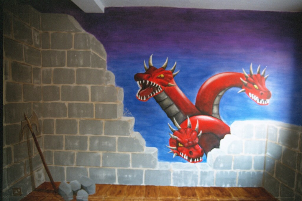 Dragons: a particularly popular theme for children’s bedrooms, created to order. (This picture is of a flat wall – note the socket in the bottom corner!)