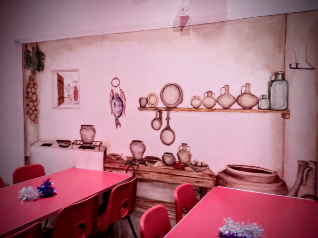 Roman Kitchen: a life-size trompe l’oeil mural commissioned by Tyne and Wear Museums for the school resources room at the reconstructed Commanding Officer’s House at Arbeia Roman Fort.