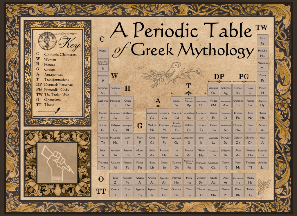 Periodic Table for A Periodic Table of Greek Mythology, published by Contubernales Books and edited by the Working Classicists.